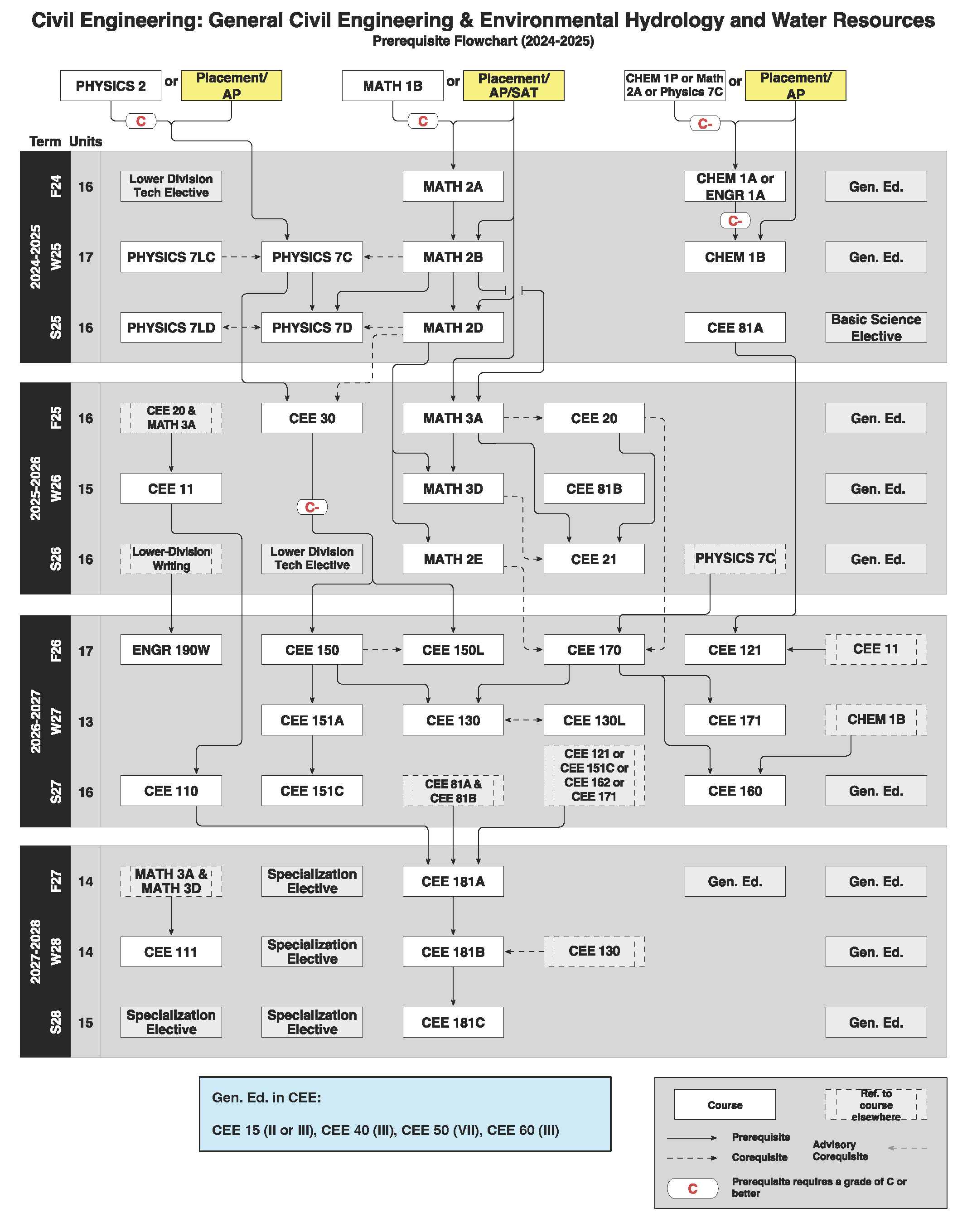 The goal of the Civil Engineering curriculum is to prepare graduates for a career in practice, research, or teaching. At the undergraduate level a common core of fundamental subjects is provided, and students are required to specialize in their senior year. Specializations are offered in General Civil Engineering, Environmental Hydrology and Water Resource Engineering, Structural Engineering, and Transportation Systems Engineering. Concentrations are offered in Computer Applications, Engineering Management, Infrastucture Planning, and Mathematical Methods. Graduate opportunities are in three major thrust areas: structural analysis, design, and reliability; transportation systems engineering; and water resources and environmental engineering.